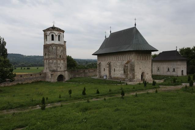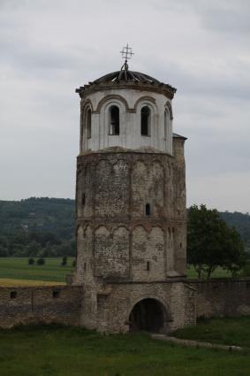 Turnul clopotniţă a fost construit în 1743 de Macarie Hrisoverghiu. Are trei niveluri, cu o înălţime totală de 30 m. Primul nivel este de formă dreptunghiulară, celelalte de formă octogonală. Primul etaj cu ferestre de tragere a fost locuinţa paznicilor turnului. La al doilea etaj a fost paraclisul, prevăzut cu o cupolă semisferică în partea centrală. Al treilea etaj al clopotelor are ferestre largi, pe fiecare dintre cele opt laturi. Prin urmare, turnul clopotniţei a fost în trecut şi străjer al curţii, şi paraclis, şi clopotniţa. Turnul este întărit cu contraforturi. După cutremurele din 1977 şi 1986 s-au făcut lucrări de restaurare.